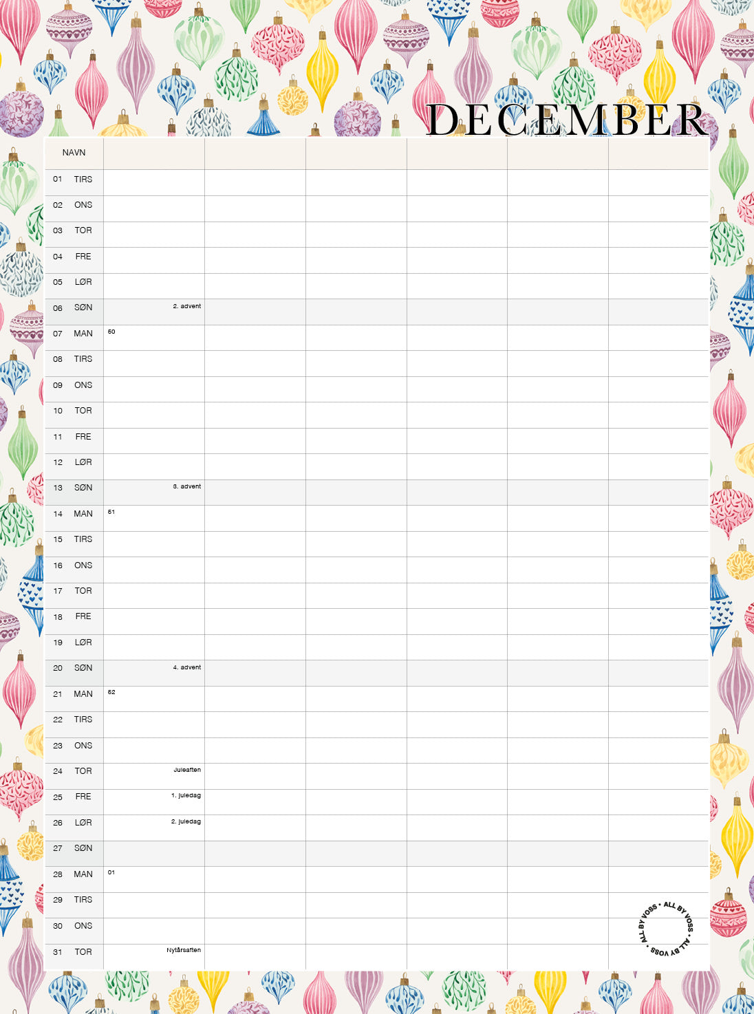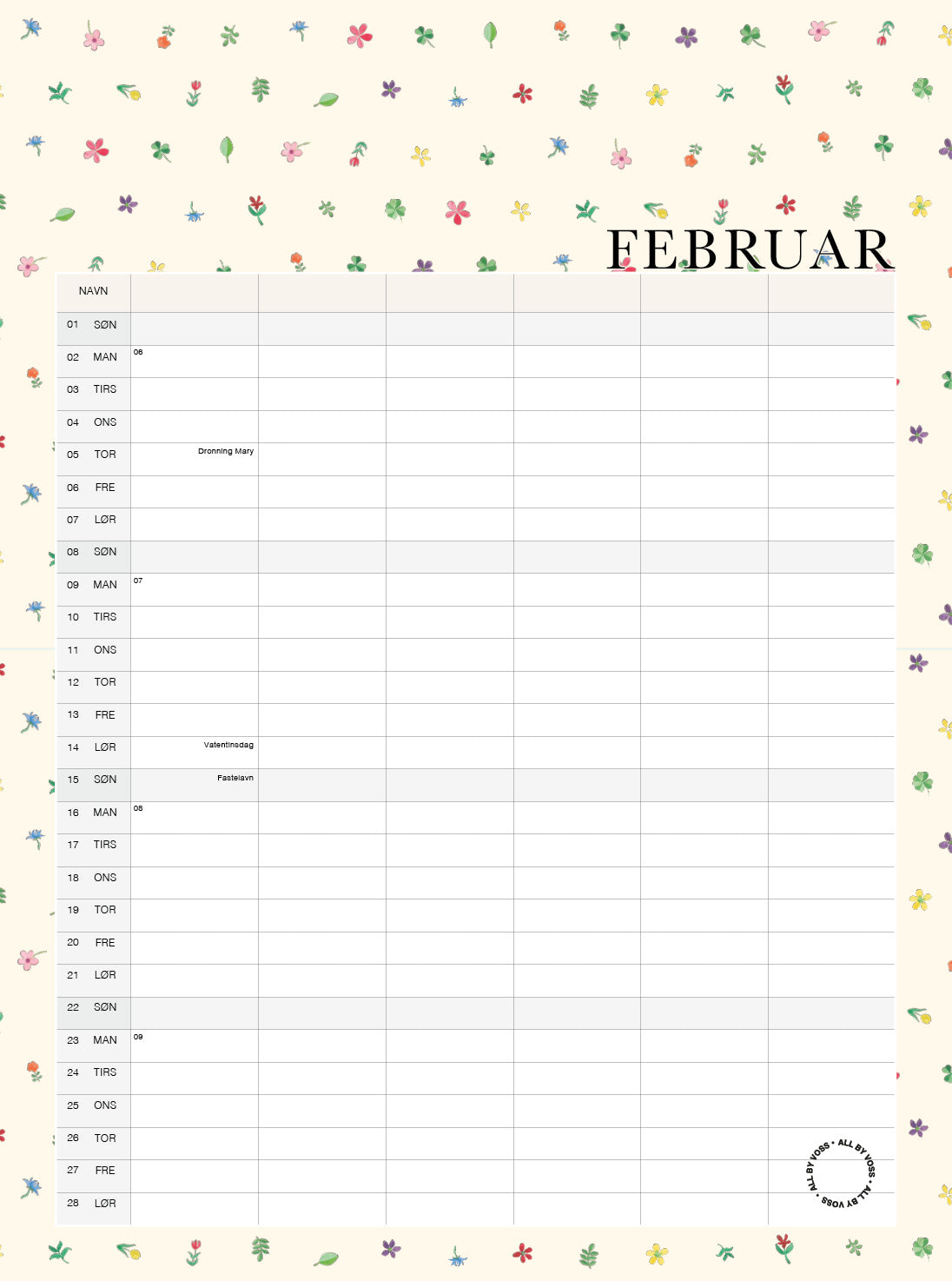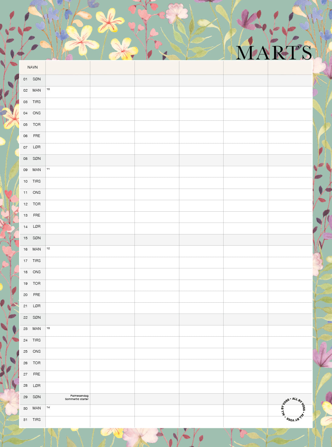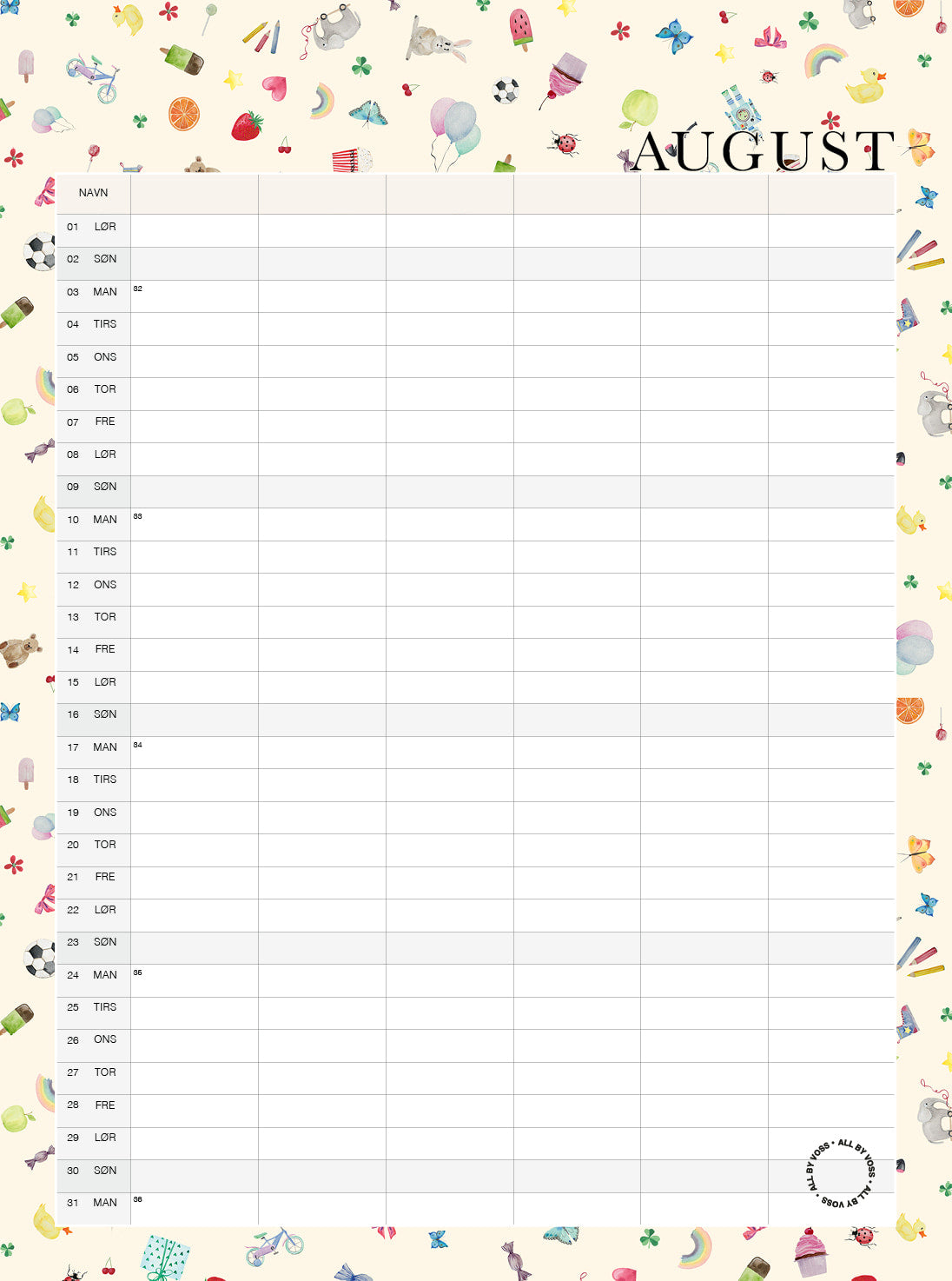 Hver måned er opdelt i 6 kolonner, så hvert familiemedlem (eller person i kollektivet) har sin helt egen kolonne til hver dag. Det gør det rigtig nemt at holde et visuelt overblik over hele familiens aktiviteter, - så man i sidste ende når det hele.