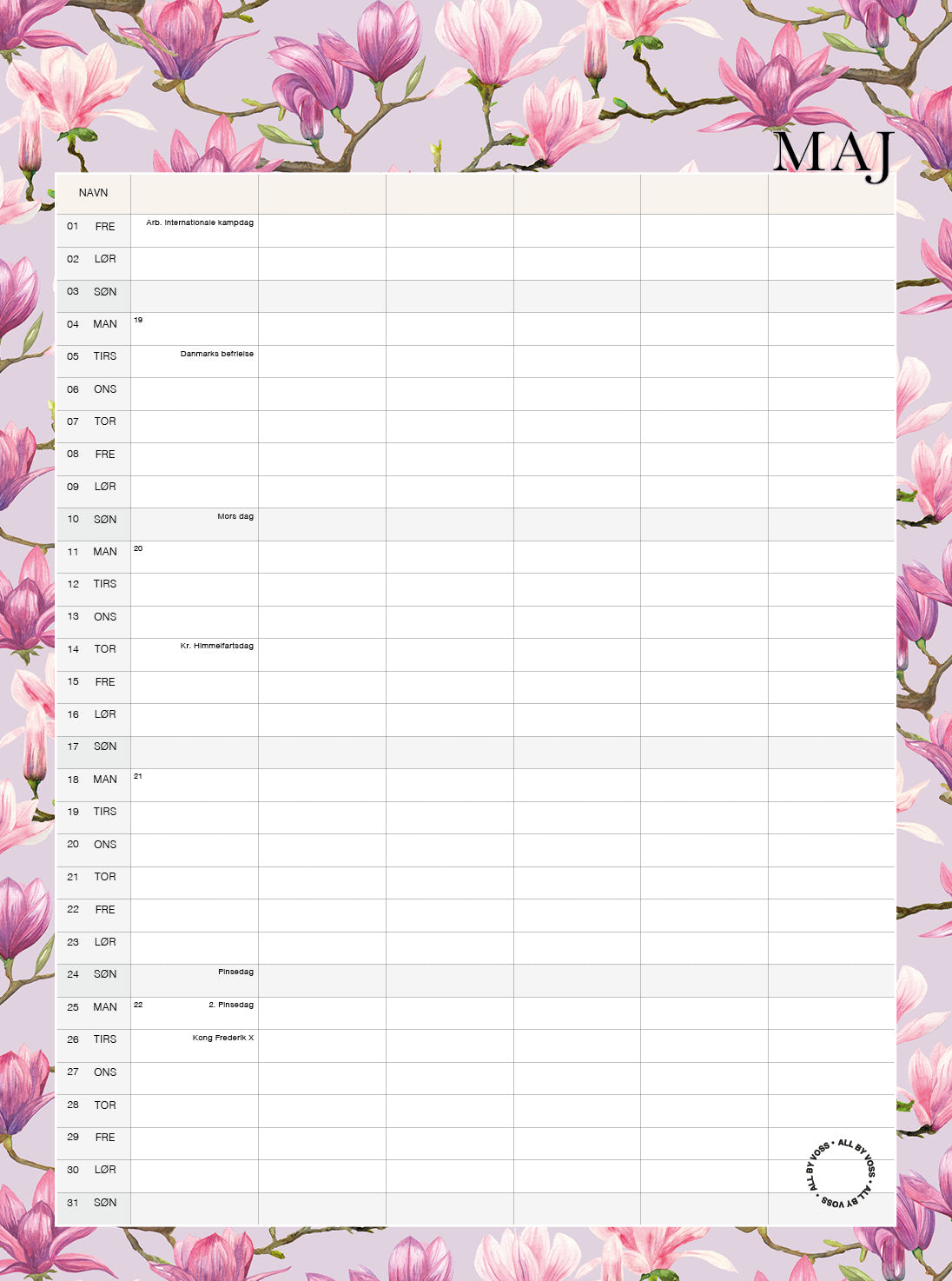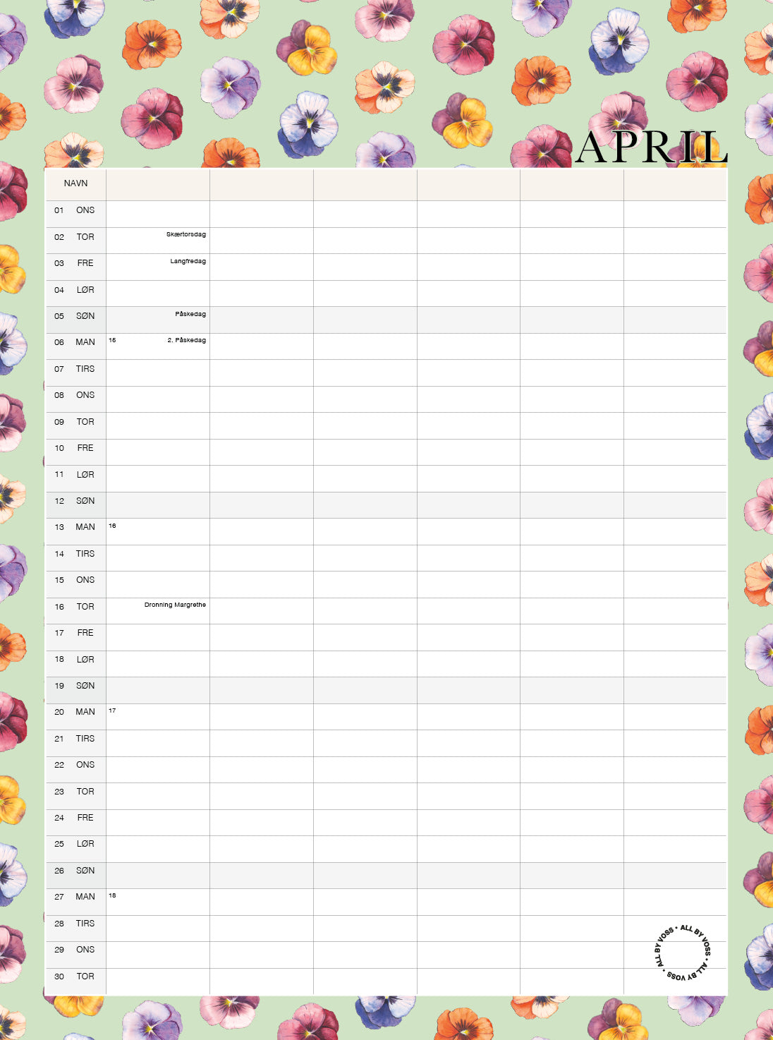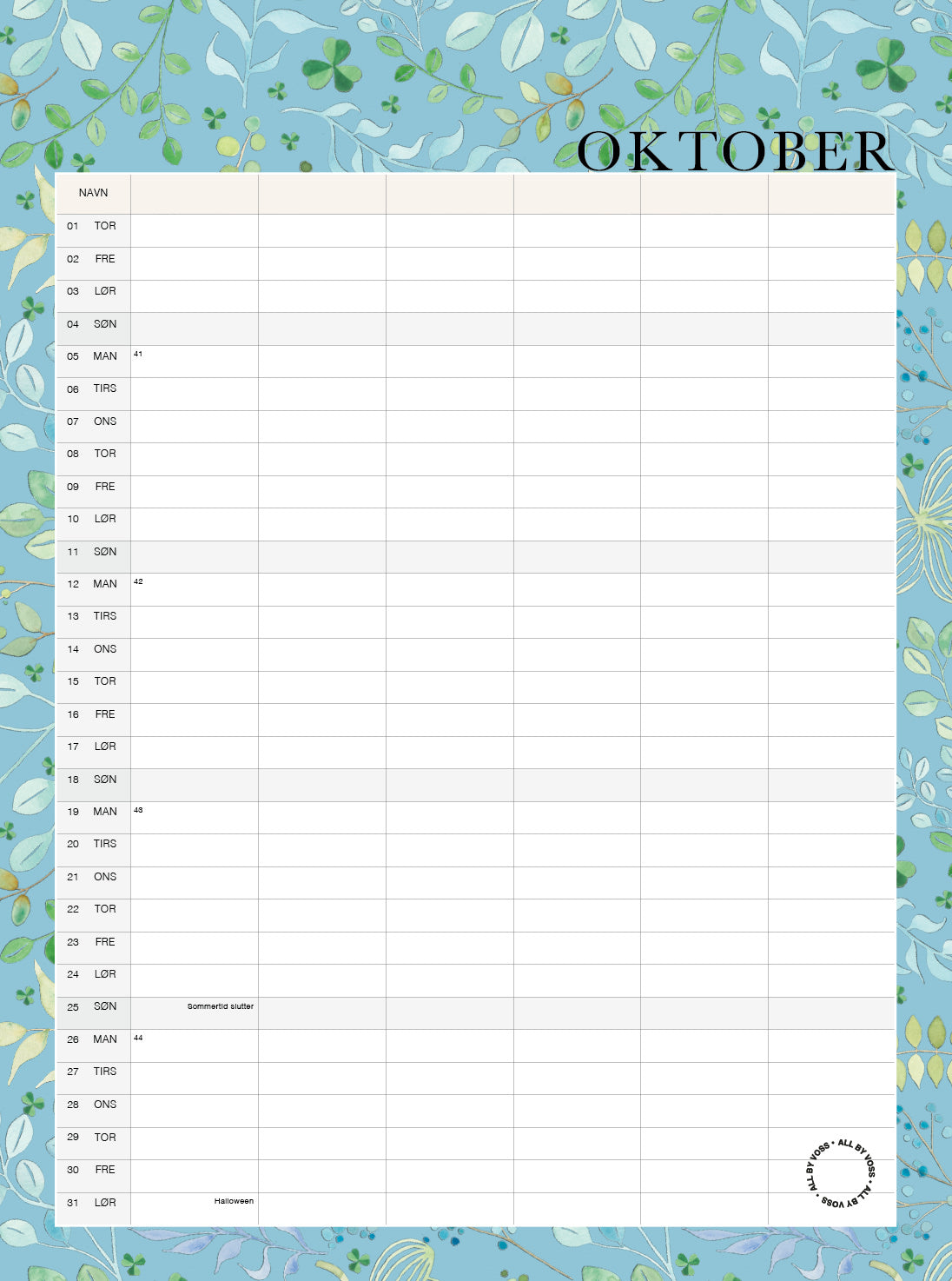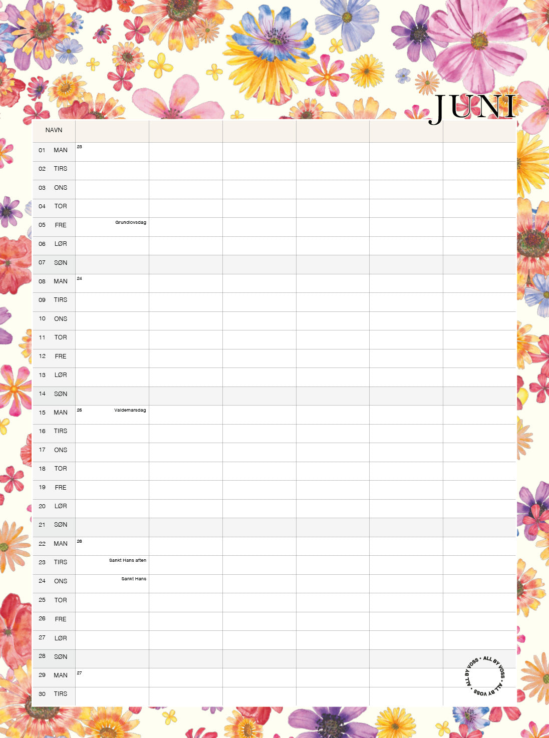 Hver måned er opdelt i 6 kolonner, så hvert familiemedlem (eller person i kollektivet) har sin helt egen kolonne til hver dag. Det gør det rigtig nemt at holde et visuelt overblik over hele familiens aktiviteter, - så man i sidste ende når det hele.