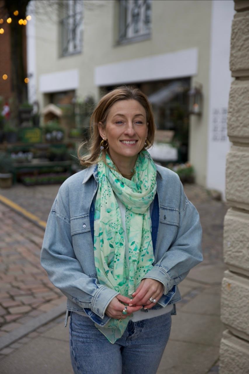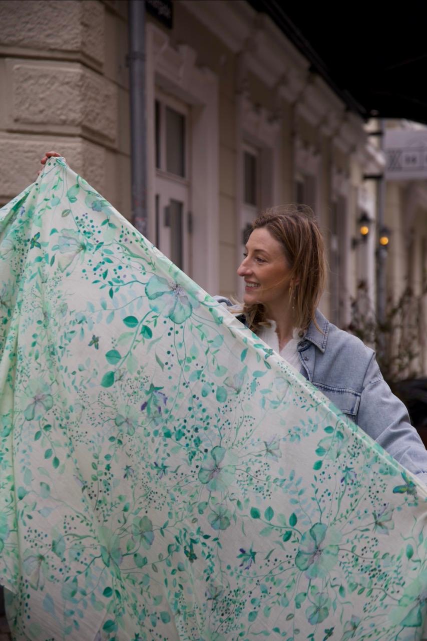 Botanic Lavender Tørklædet i 100% bomuld består af det smukkeste farvemiks af grønne nuancer på varm cremefarvet bund. Tørklædet er super anvendeligt og elegant.