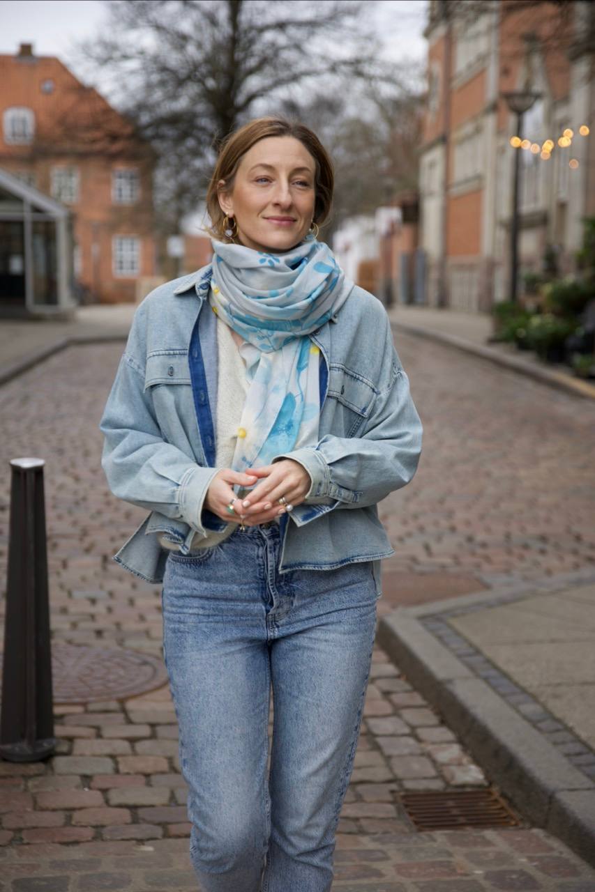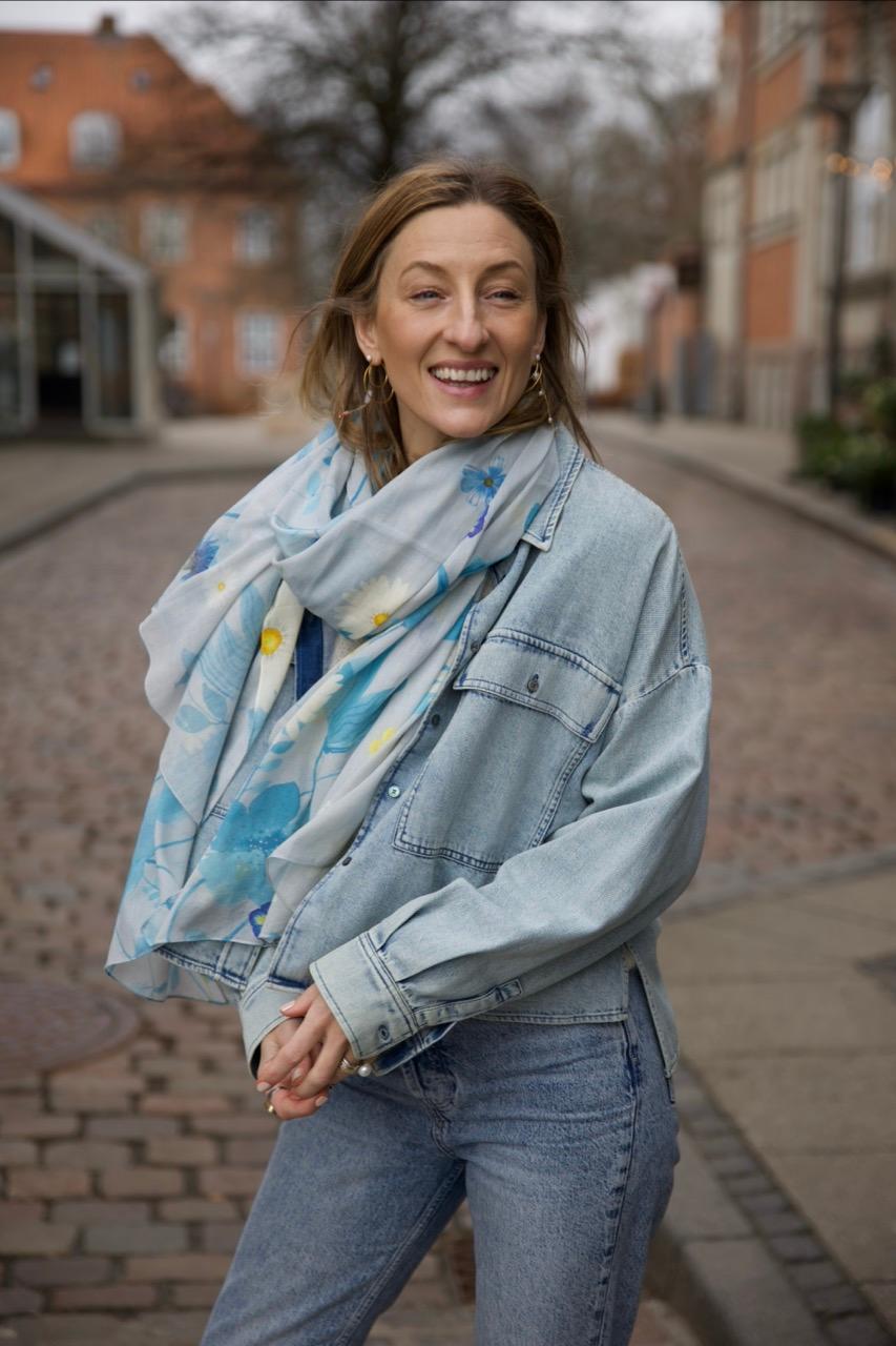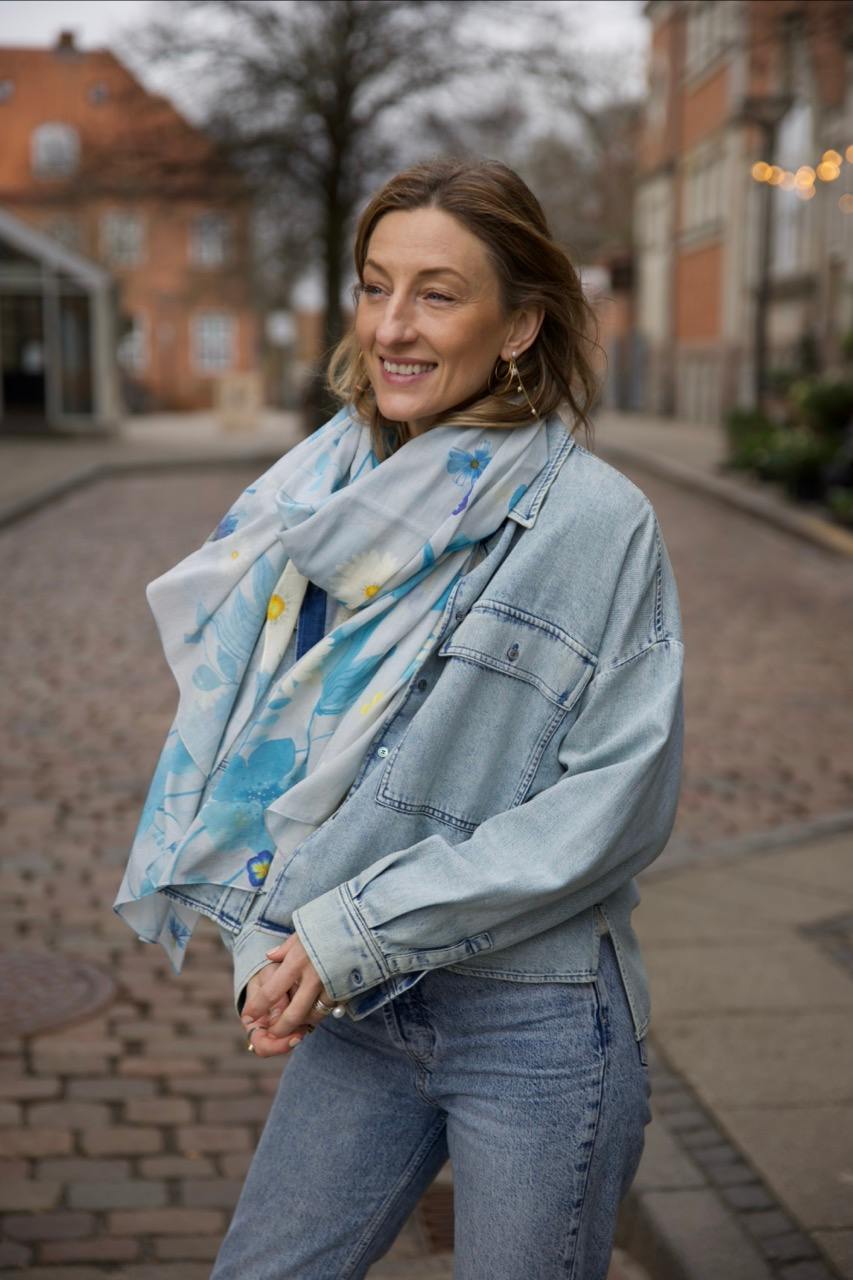 Botanical Daisy Tørklædet i 100% bomuld består af det smukkeste farvemiks af blå, hvide og gule nuancer på lys grå bund. Tørklædet er super anvendeligt og elegant.