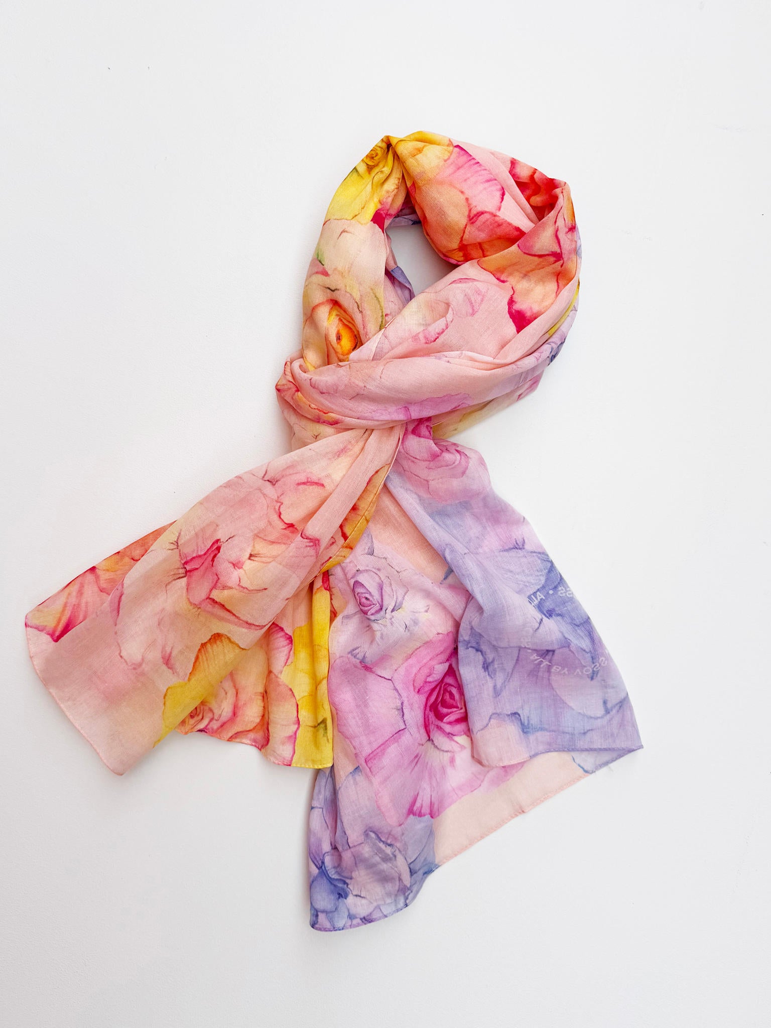 Rose FieldTørklædet i 100% bomuld består af det smukkeste farvemiks af rosa, lilla, gul, orange og pink på ferskenfarvet bund. Tørklædet er super anvendeligt og elegant.