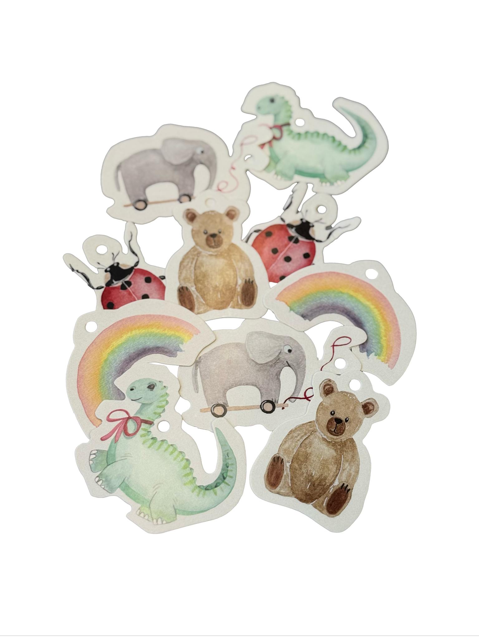 10 gavemærker med søde børnemotiver. Der er 2 x 5 motiver, 10 gavemærker i alt.