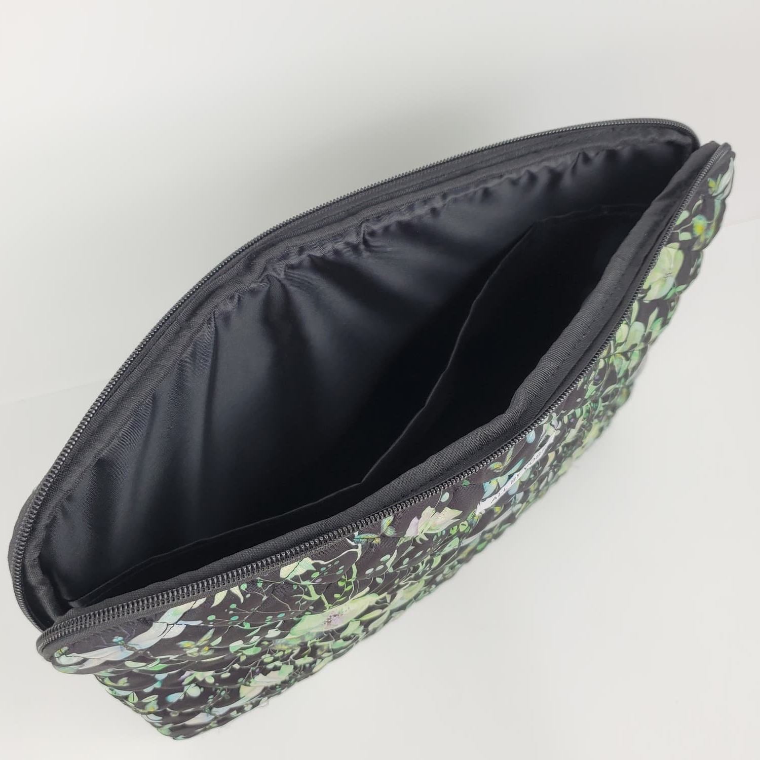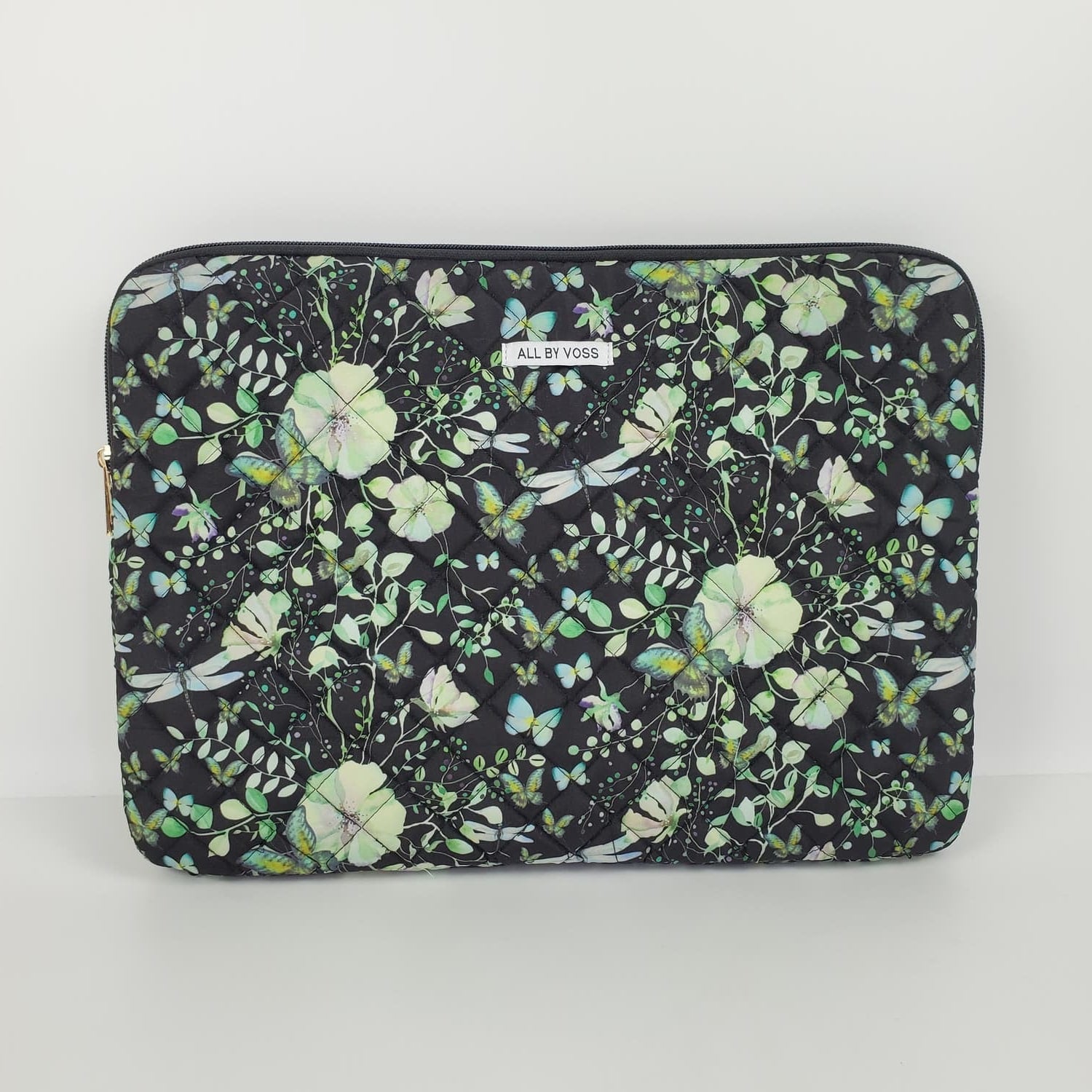 Forkæl dig selv eller én du holder af med denne slidstærke, smukke quiltede computersleeve med akvarelmotiver af grønne sommerfugle og botanik på sort bund. Det er fremstillet af kraftigt, quiltet genanvendt polyester, der tåler at blive brugt.