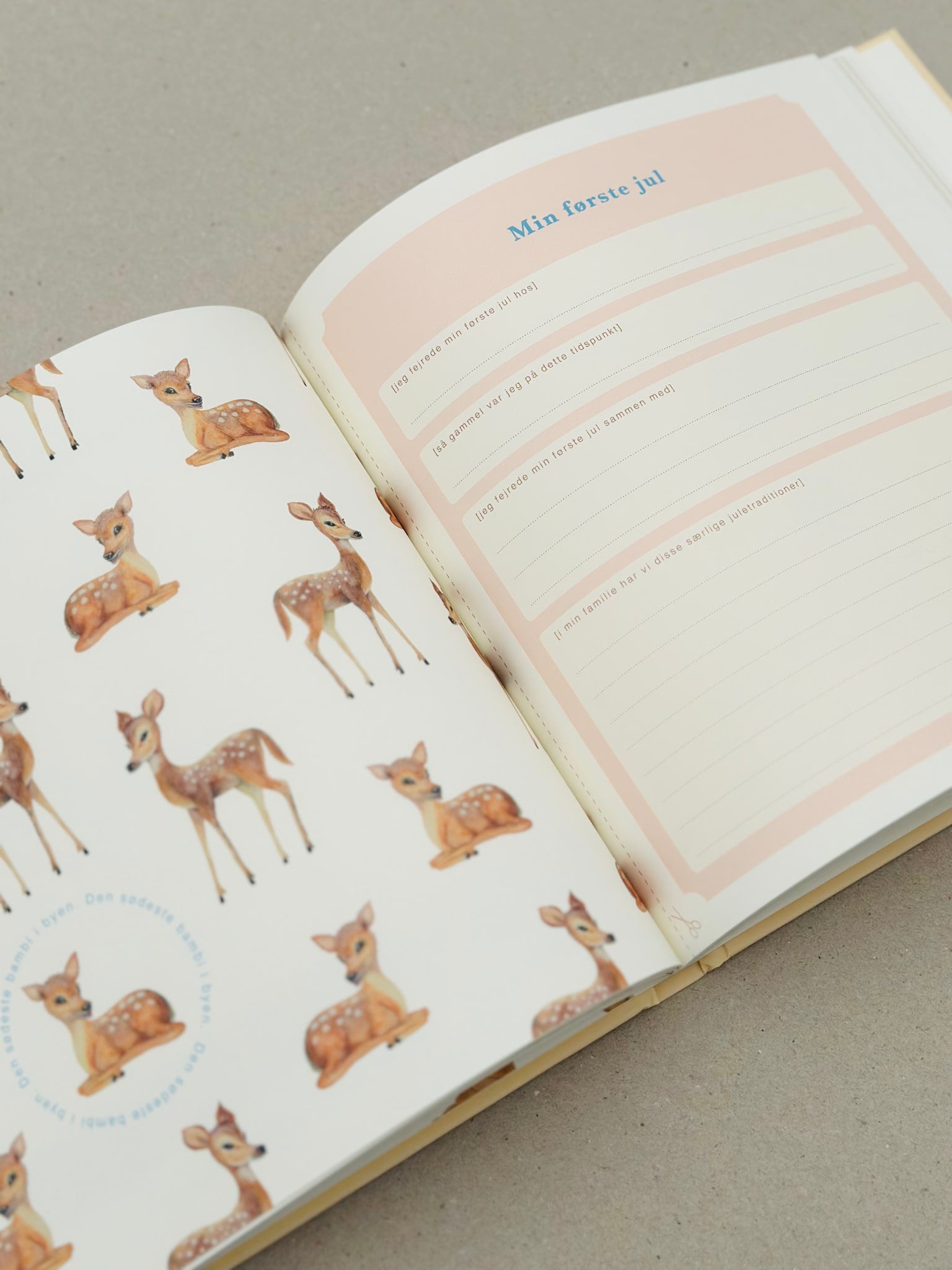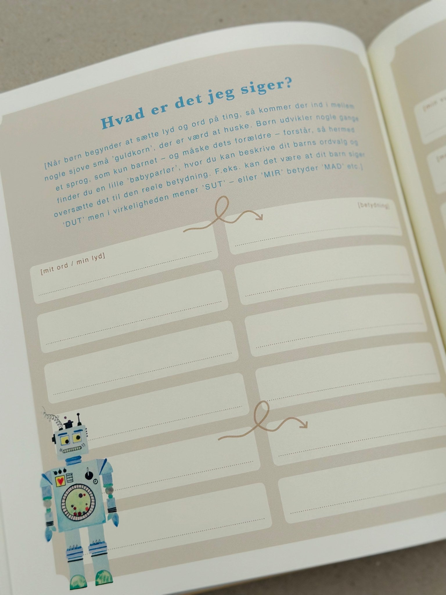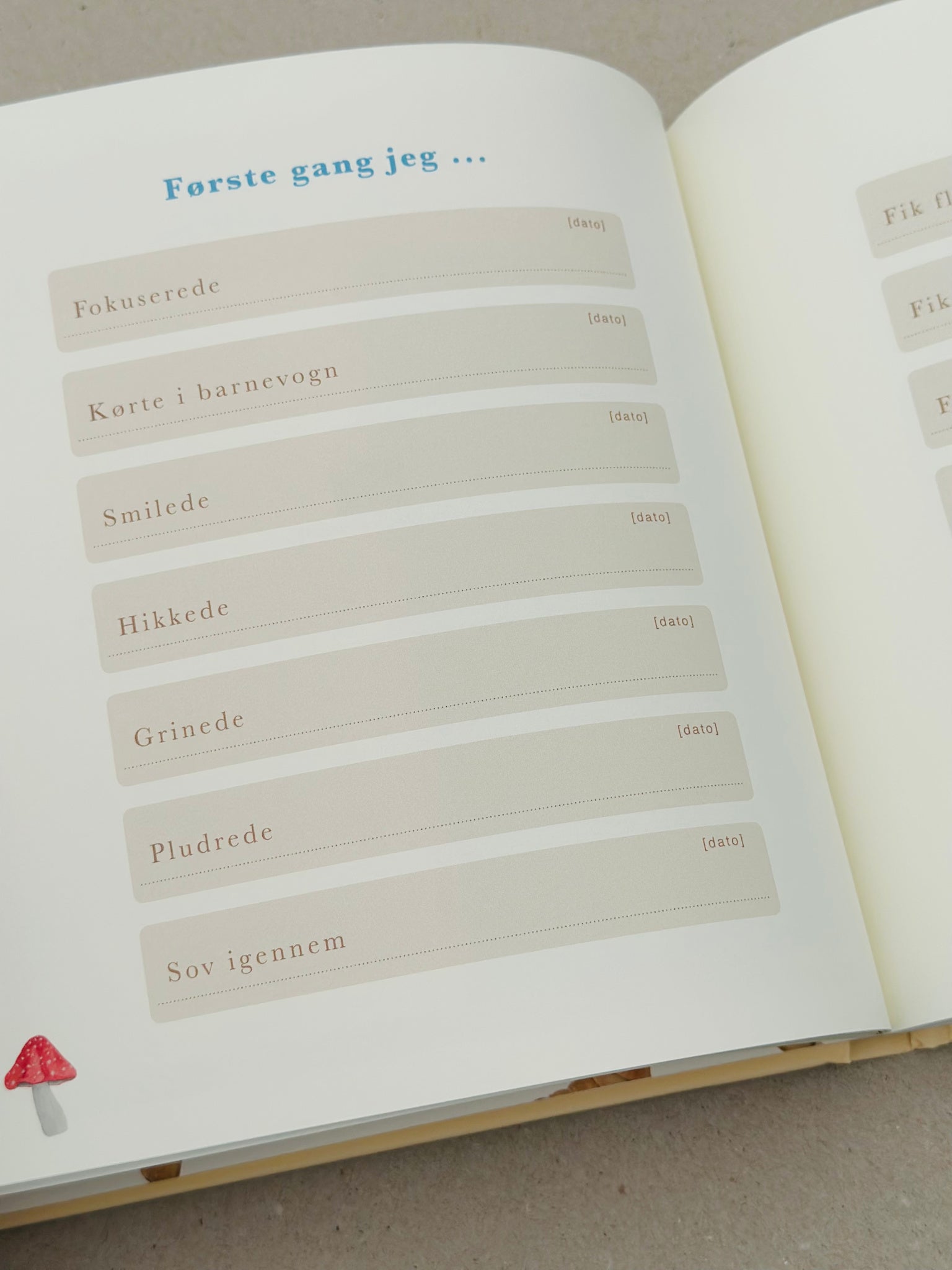 Bogen udfyldes af forælderen med historier og anekdoter om barnet, billeder fra årernes løb, hånd- og fodaftryk, stamtræ osv. fra barnets første 5 leveår.