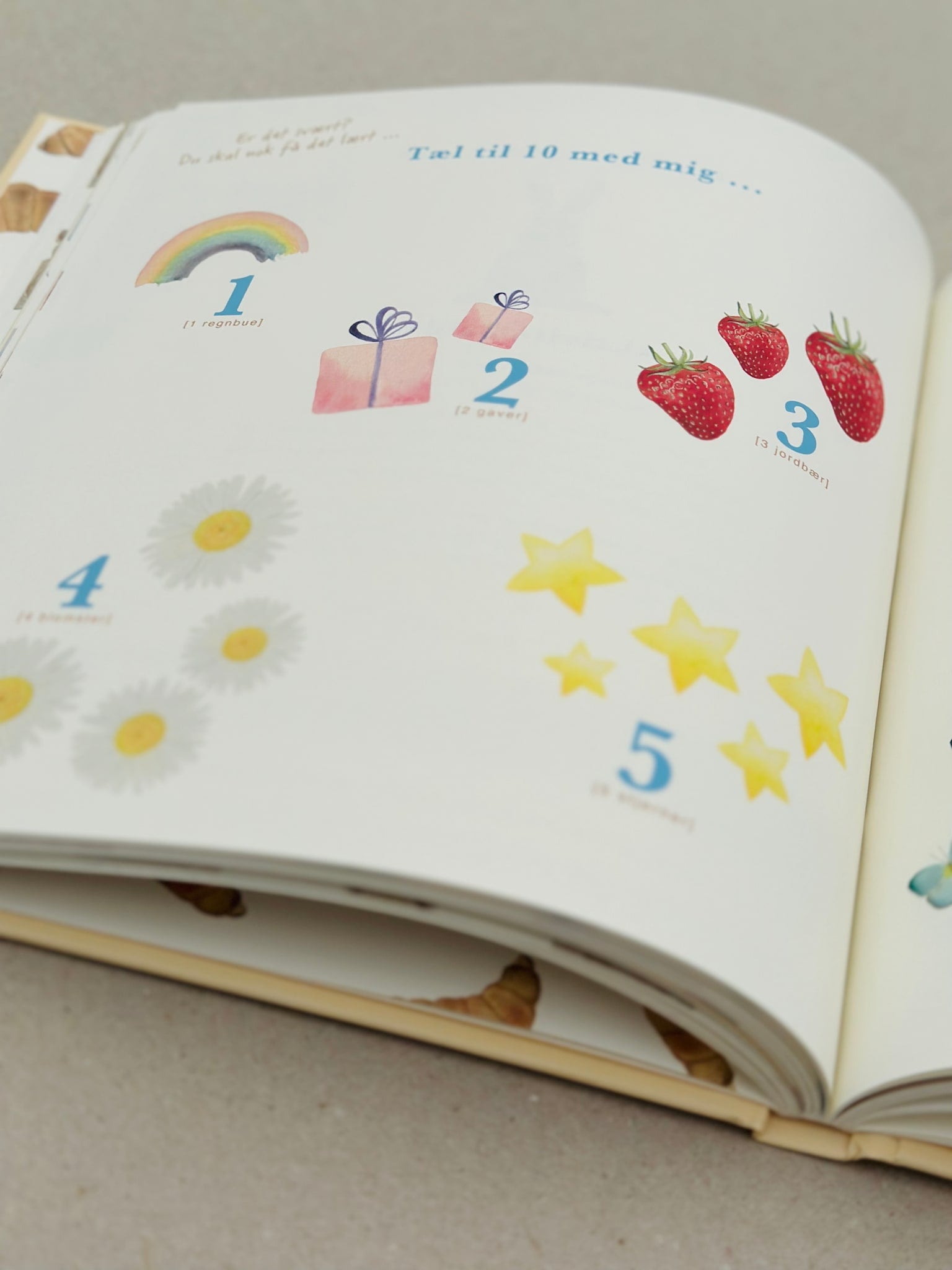 Bogen indeholder opslag om blandt andet barnets forældre og øvrige familie, fødslen, et fint stamtræ, historier fra hverdagen, eventuelle søskende, info om barnets navn og stjernetegn, minder fra barselstiden, gæster og gaver, barnets første tegninger, hånd- og fodaftryk, søde historier fra vuggestue og børnehaven, besøg fra sundhedsplejersken, barnets vækst og meget, meget mere…