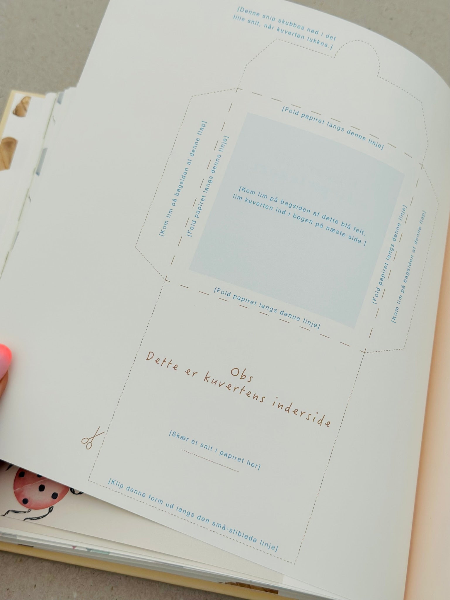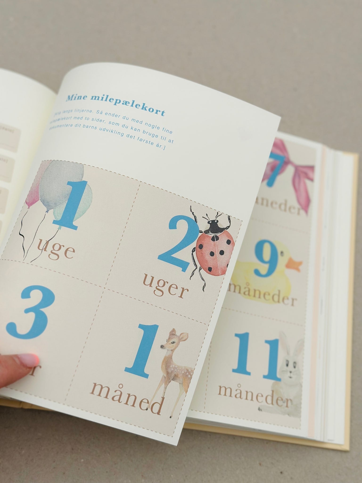 Derudover er der i bogen milepælekort, som kan klippes ud og anvendes til fotos. Der er også et par fine aktivitetssider midt i bogen, som gør at bogen bliver relevant at tage frem og kigge i sammen med barnet – på den måde husker man at få bogen frem jævnligt og få siderne udfyldt, og barnet bliver bevidst om, at bogen eksisterer.