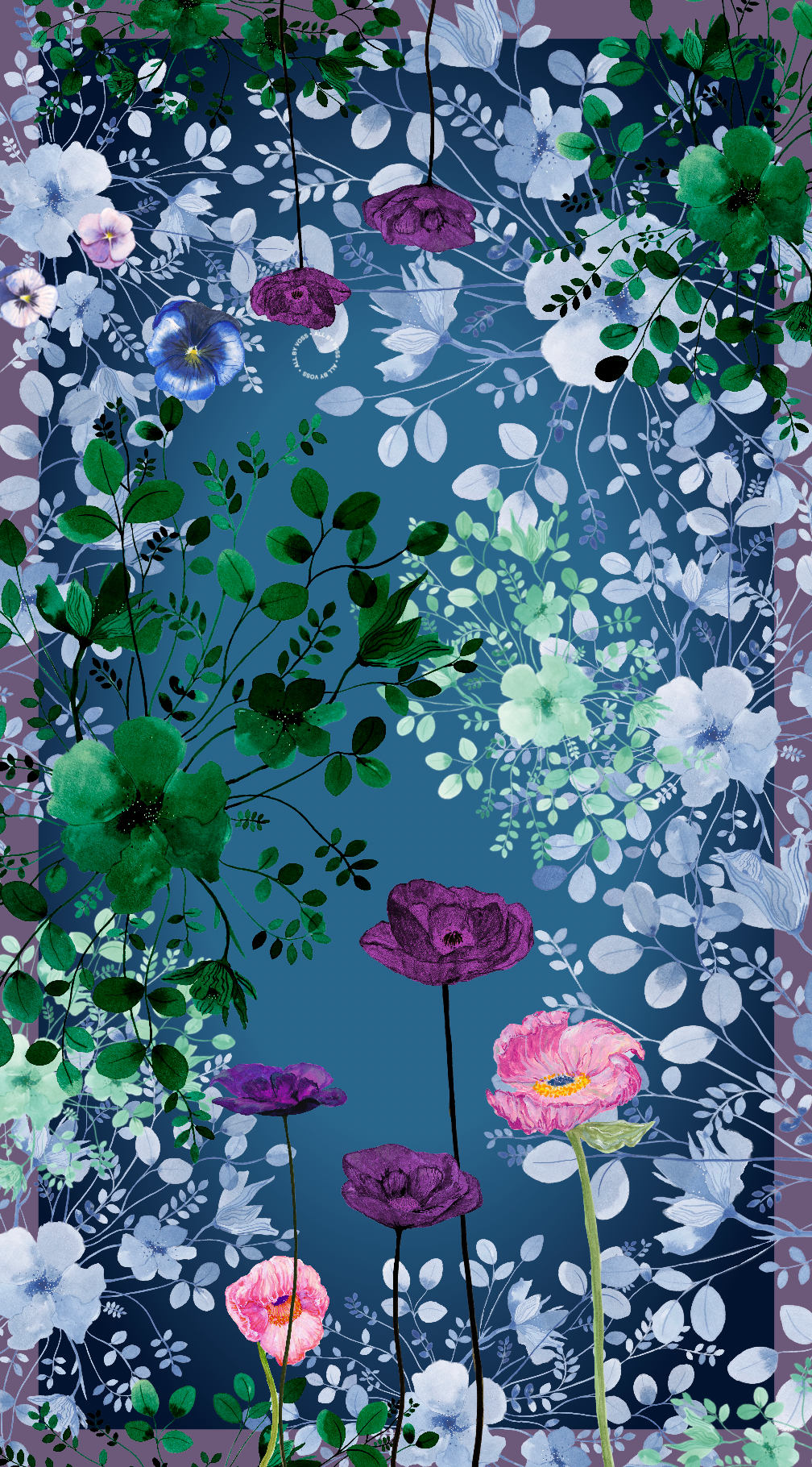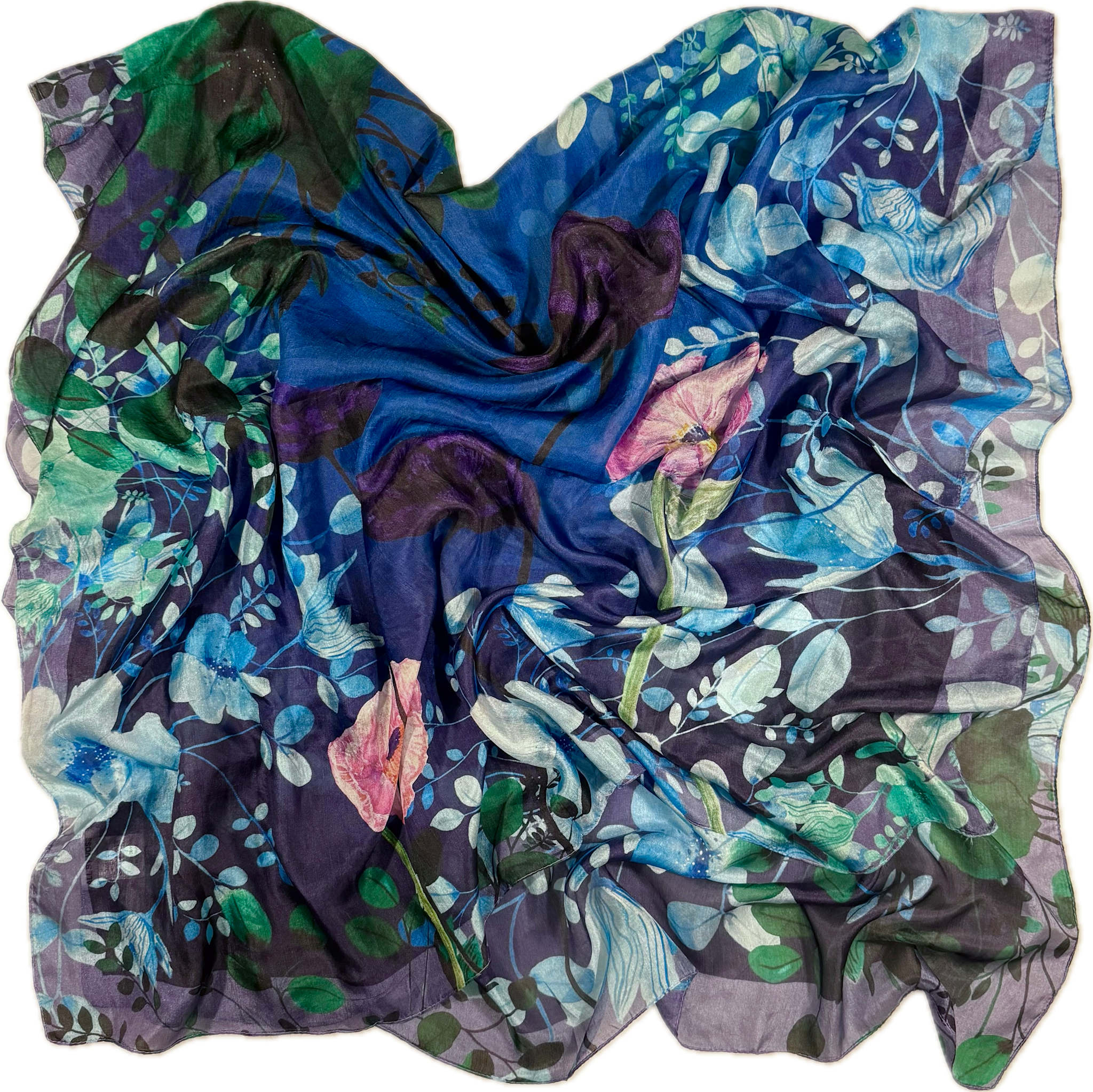 Så skal du klart have fingrene i dette smukke silketørklæde, der lægger sig blidt om halsen på dig, og giver dig glød i kinderne med de smukke nuancer af blå, grøn og lilla med smukke blomster.
